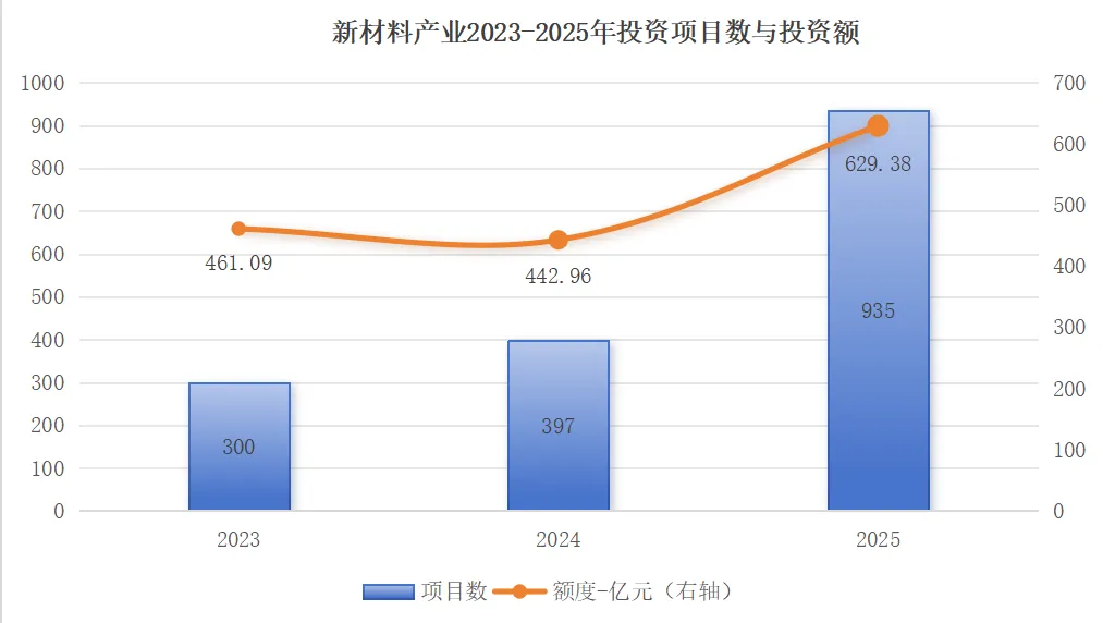2025年,中国新材料产业在“十五五”规划强调科技自立自强和培育新质生产力的宏观战略指引下,延续了高景气度。产业投资呈现出国产替代加速、前沿技术驱动、产业资本主导三大核心特征。全年公开天使轮、VC、PE等阶段投资事件总计935项,已披露的总融资额高达629.38亿元人民币,同比增长42.1% 。2025年,与2024年行业整体投资承压小幅增长相比,2025年的投资活动更为活跃和聚焦,投资事件数较2024年激增135.5%,相比2023年(300项)增长211.7%。资本参与度达到空前水平。