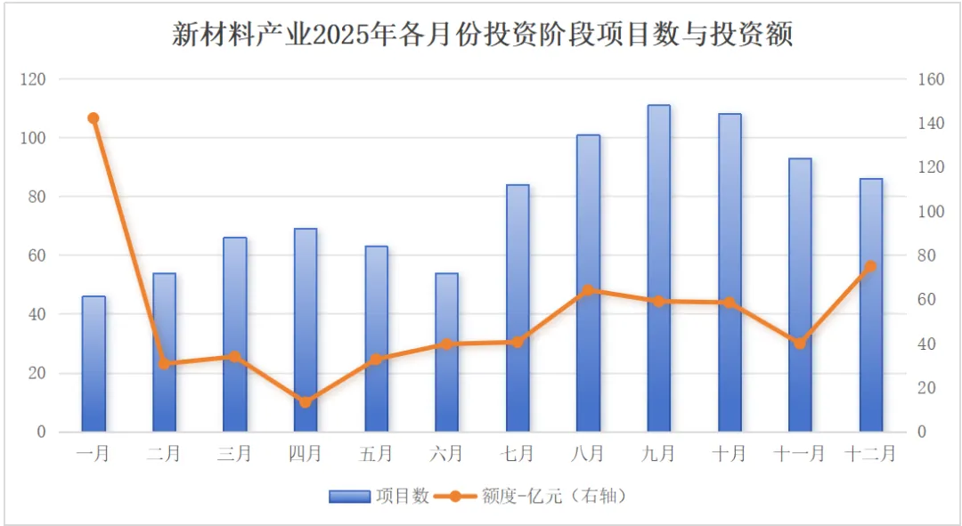 上图展示了2025年中国新材料产业月度投融资情况,清晰地反映出“前稳后高、年末冲高”的趋势: