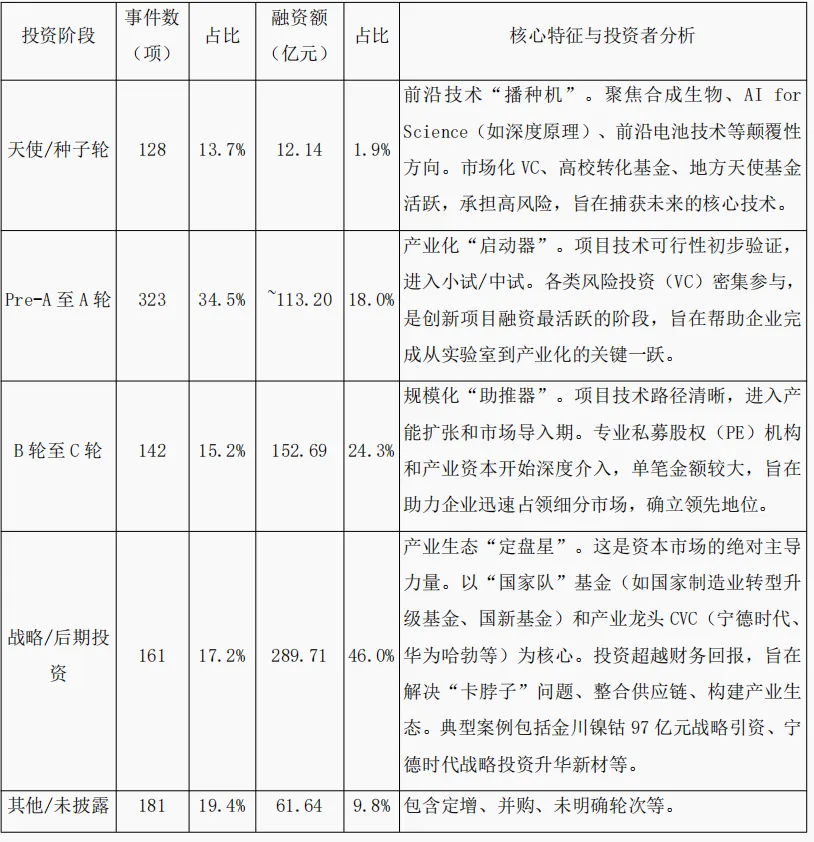 从月度趋势看,投资活动呈现前稳后高、逐季升温的态势,下半年(7-12月)投资事件占比超过62%,显示出资本布局的系统性与持续性增强。投资阶段分布呈现显著的“哑铃型”结构,一端是专注于早期前沿技术孵化的风险投资(天使/种子轮至A轮融资事件占比近半),另一端是产业龙头与“国家队”主导的战略性投资,以不到两成的事件数贡献了近半数的融资总额。
