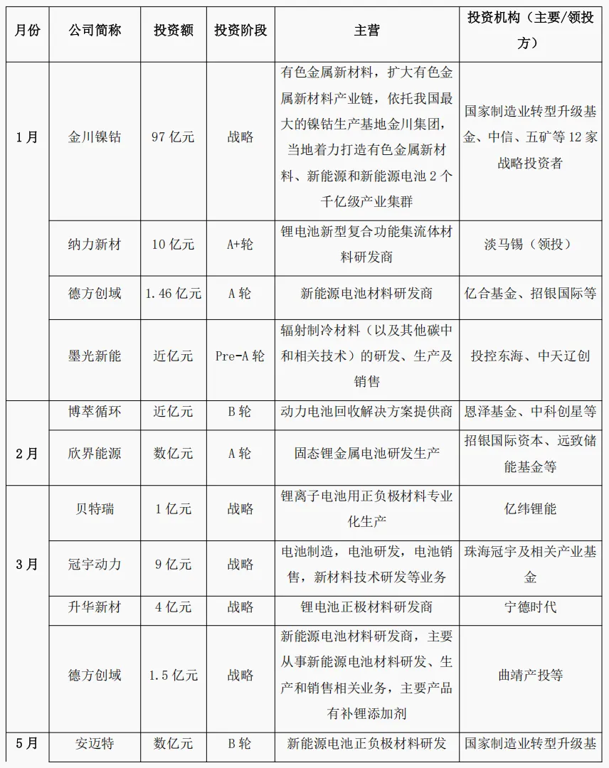 战略资本主导巨额投资:开年的金川镍钴(97亿元) 和年中的 冠宇动力(9亿元)等超大额融资,均由具有产业背景的“国家队”或龙头产业资本主导,旨在保障关键矿产资源和控制核心产业链环节。