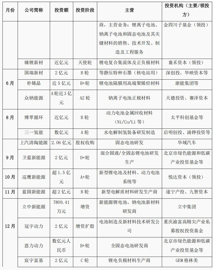 固态/半固态电池材料:成为年度最热赛道,融资事件密集,如太蓝新能源、恩力动力、卫蓝新能源等。资本押注于固态电解质、锂金属负极等关键材料的突破。