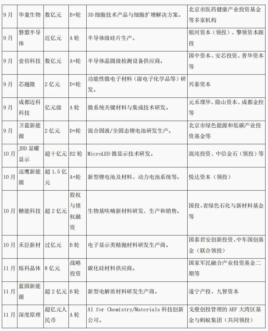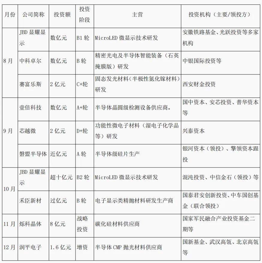 显示与微显示材料异军突起:围绕 Micro LED 技术的材料与芯片公司(如 JBD显耀显示)获得了多轮融资,表明在新一代显示技术竞争中,上游核心材料已成为资本抢占的制高点。