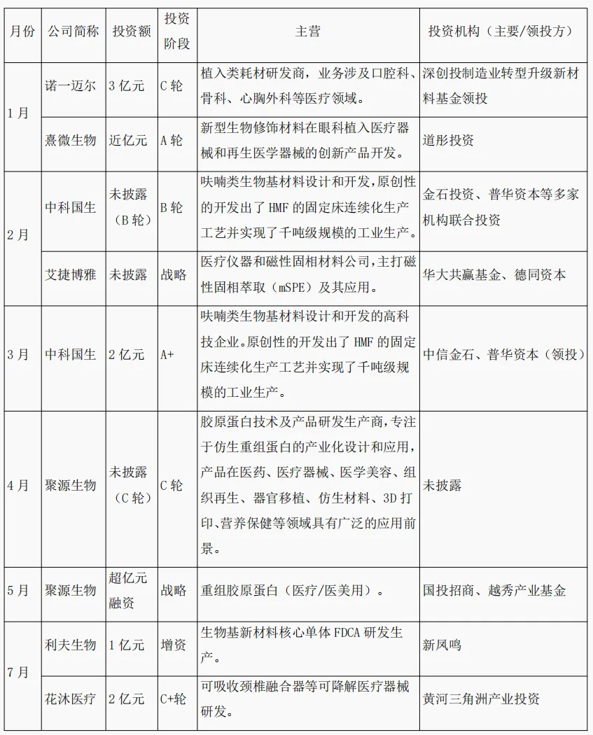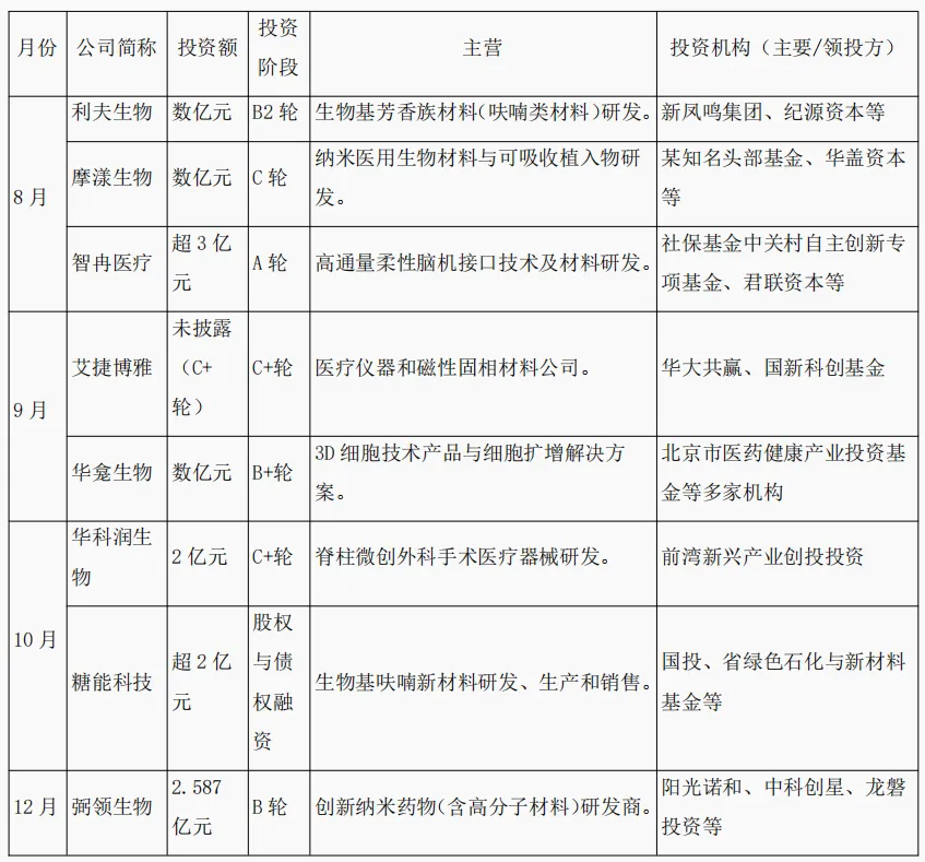 高端植入与再生医学:诺一迈尔(近3亿元C轮)、聚源生物(重组胶原蛋白)、美柏生物(人源ECM材料)等企业融资突出,产品涉及骨科、口腔、医美、软组织修复等领域。