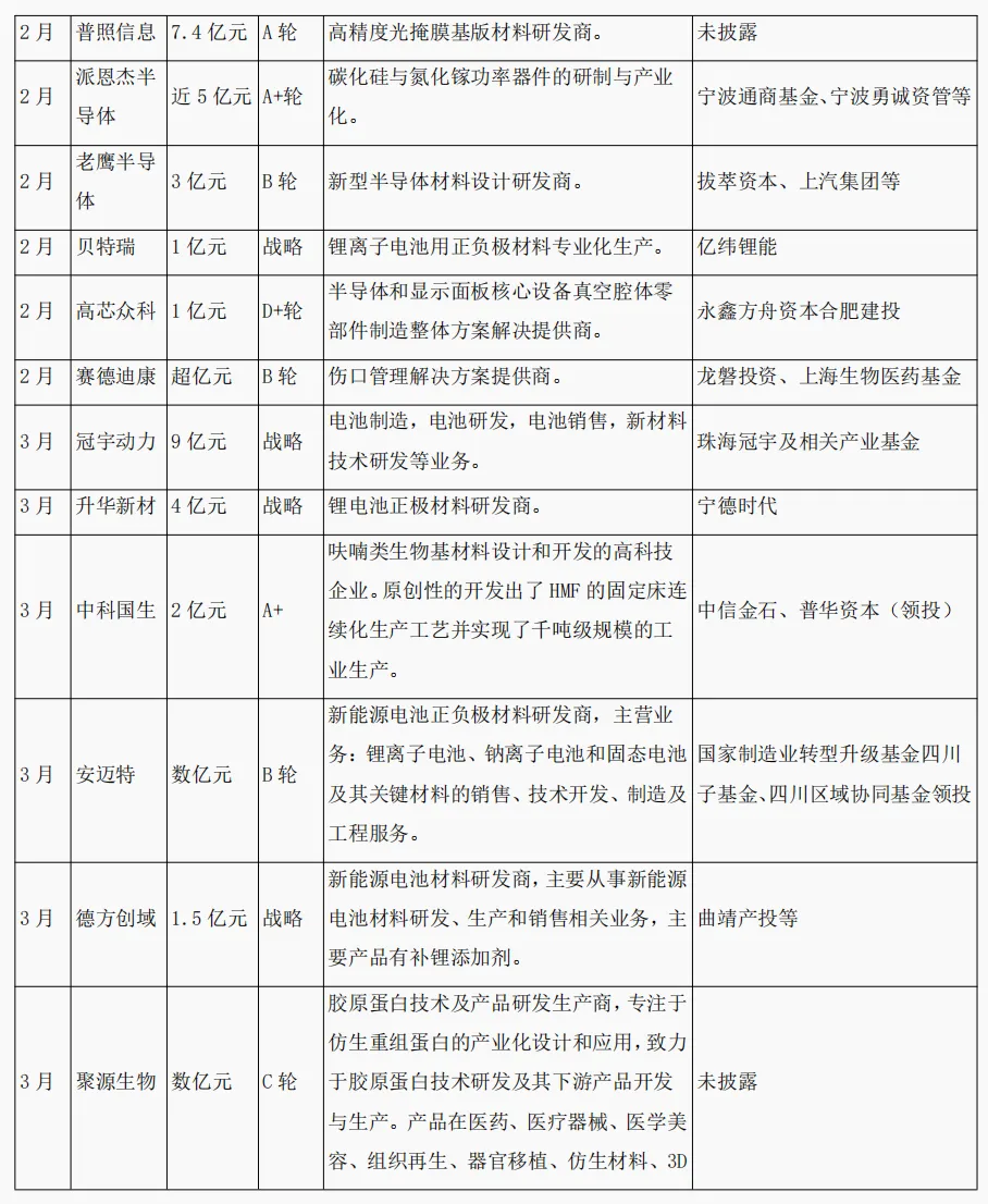 超亿元项目高度集中于新能源材料和半导体材料两大领域,这与整体细分领域的趋势完全吻合。例如,在新能源领域,有冠宇动力(9亿元)、乐凯科技(6亿元)、涟钢电磁(15亿元) 等;在半导体领域,有瞻芯电子(10亿元)、鑫华半导体(14.76亿元)、烁科晶体(8亿元) 等。这些重大项目的成功融资,为相关领域的技术攻坚和产业化落地提供了充足的资本保障。