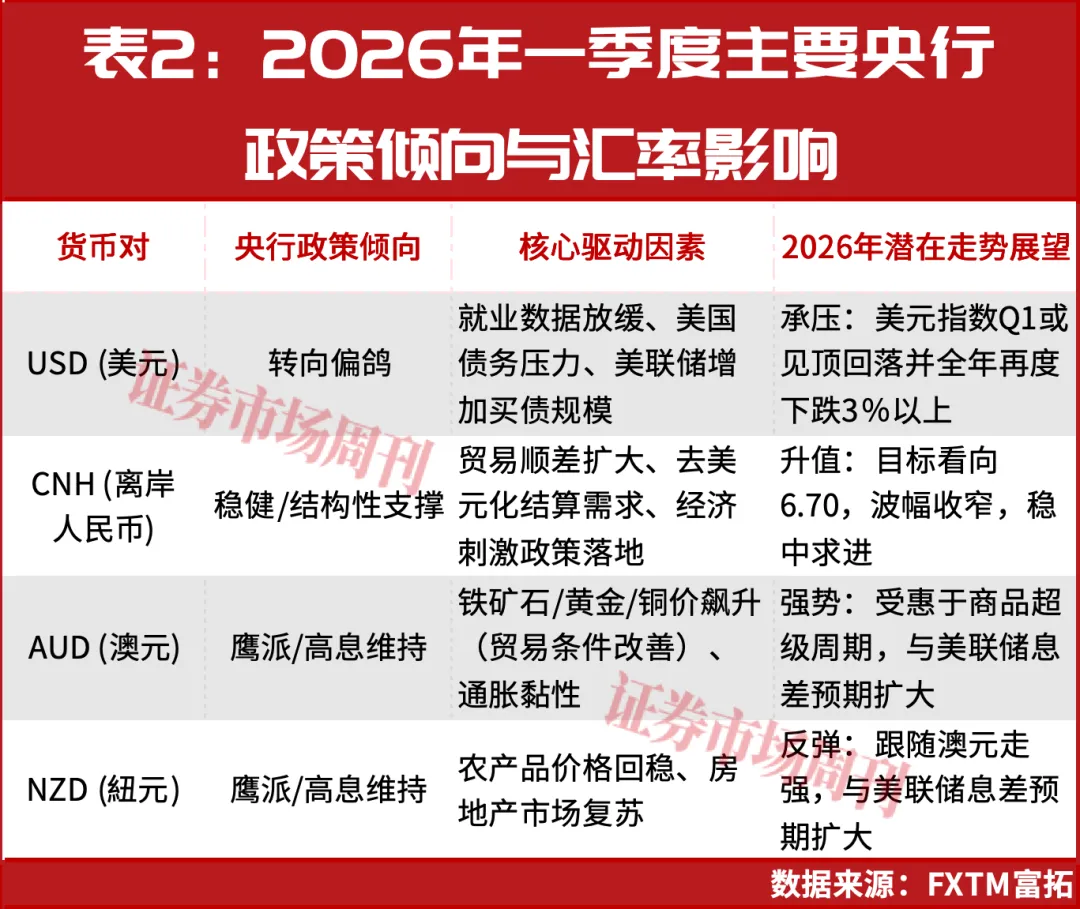 与此同时,商品货币如澳元(AUD)和纽元(NZD)也迎来了顺风环境。与美联储可能在经济放缓压力下考虑降息不同,澳大利亚央行(RBA)与新西兰联储(RBNZ)在通胀黏性与大宗商品价格高企的支撑下,货币政策立场更为强硬。这种明显的央行政策分歧,叠加商品价格的牛市,为澳元与纽元提供了上升动能的燃料。