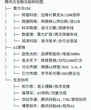 与腾讯在资本或业务上深度绑定的企业,以及为元宝提供核心技术支撑的厂商,将分享生态红利。包括语义理解、知识图谱、支付清结算系统等技术服务商,以及接入元宝生态的电商、游戏、政务等场景应用企业,有望借助流量爆发实现用户与业绩双增长。