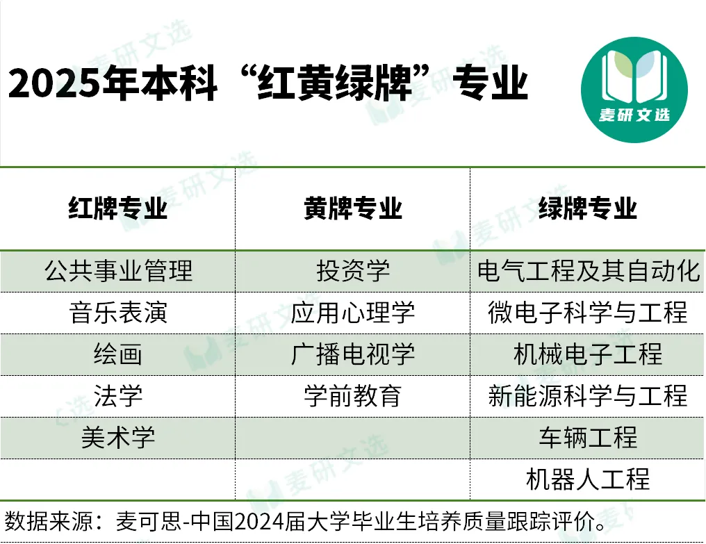 近日,麦可思研究院发布《2025 年中国本科生就业报告》,该报告依托 2024 届本科毕业生培养质量的跟踪评价数据,综合就业落实率、薪资水平、就业满意度等核心指标,并结合国家战略人才需求,正式公布 2025 年本科专业红黄绿牌名单,跟着升学君一块来看。