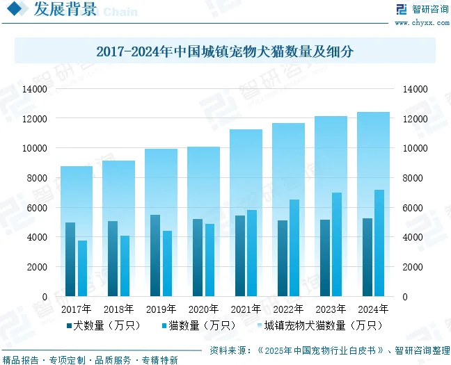 随着经济快速发展和居民生活水平显著提升,越来越多家庭拥有更为充裕的可支配收入,饲养宠物逐渐成为一种广受欢迎的生活方式。宠物不仅为人们提供情感陪伴,更被视为家庭生活的重要组成部分,折射出当代消费者对生活品质的个性化追求。为了保障宠物的健康与福利,主人愿意为其购买优质食品、精美玩具与专业医疗服务,从而催生了宠物行业的繁荣发展。在此背景下,我国城镇宠物数量整体呈现逐年增长的态势。数据显示,中国城镇宠物犬猫数量从2017年的8746万只增长至2024年的12411万只,年复合增长率为5.13%。其中,犬数量从2017年的4990万只增长至2024年的5258万只,年复合增长率为0.75%;猫数量从2017年的3756万只增长至2024年的7153万只,年复合增长率为9.64%。持续增长的宠物数量为宠物服务行业创造了广阔市场需求,推动宠物美容、训练、保险等多元化服务领域加速发展,形成产业链协同并进的良性发展格局。
