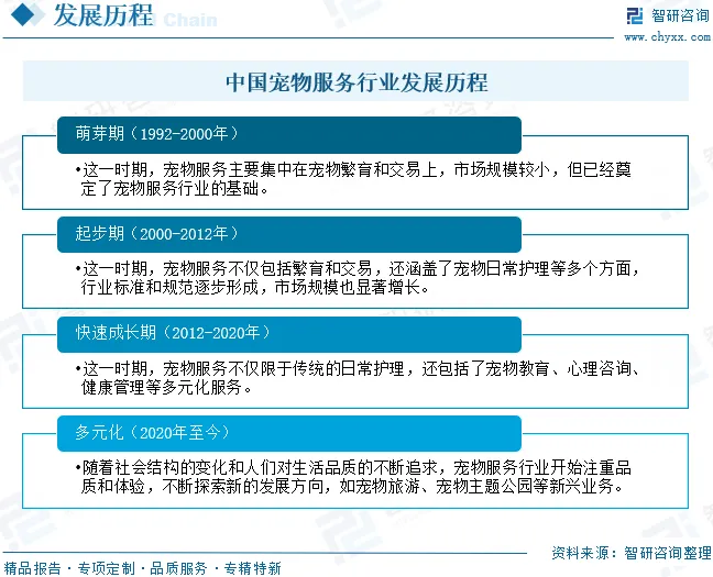 自1992年9月中国小动物保护协会在北京成立以来,我国宠物行业正式形成,并开始系统倡导“宠物作为人类伴侣”的理念,推动宠物概念在国内逐渐兴起,为后续宠物服务行业发展奠定了认知基础。历经三十年演进,宠物服务行业从萌芽阶段逐步进入服务内容不断丰富的快速成长期,并进一步迈向多元化和精细化的发展新阶段,经历了从简单的繁育和交易到全面覆盖宠物全生命周期的多元化服务的转变。