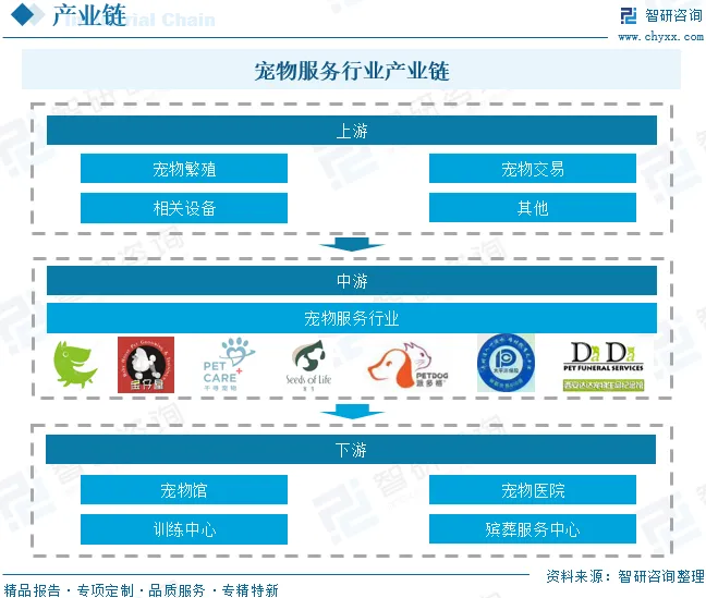 宠物服务产业链以宠物活体供应为起点,上游涵盖宠物繁殖、品种改良及活体交易,包括线下宠物店、线上平台等多元化销售渠道,但市场集中度较低;中游包括宠物医疗、美容、训练、保险及殡葬等多元化服务领域,下游主要为服务具体场景,包括宠物馆、宠物医院、训练中心、殡葬服务中心等。