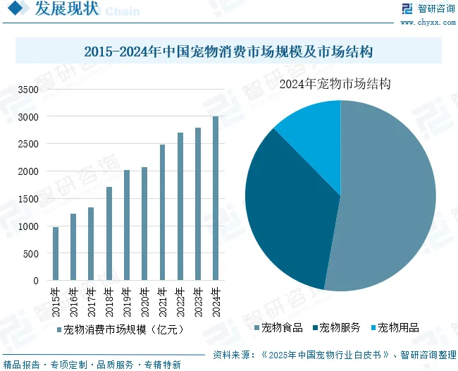 近年来,随着我国居民生活水平的提升、情感需求的日益凸显以及消费观念的转变,宠物经济迎来了爆发式增长。从日常的宠物食品、用品到专业化的医疗、美容服务,再到新兴的宠物保险、殡葬等领域,宠物消费市场不断扩容,并且呈现出品质化、个性化、多元化的发展态势。数据显示,中国宠物消费市场规模从2015年的978亿元增长至2024年的3002亿元,年复合增长率为13.27%。从市场结构来看,2024年宠物食品占比52.8%,是最大细分市场,且产品相比于用品等宠物赛道粘性突出,尤其是猫主粮商业类似奶粉,沉淀品牌价值。其次是宠物服务(包括宠物医疗),占比34.8%。宠物用品占比12.4%,上市龙头以海外代工业务为主,产品向智能化发展。