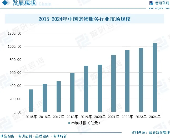 21世纪以来,随着国内养宠政策的逐渐放开,中国宠物行业迎来了前所未有的增长期。“宠物”已不再仅仅被视为看家护院的工具,而是成为了家庭中不可或缺的情感寄托和生活伴侣。同时,城市化进程的加快和人口结构的变化,进一步推动了宠物行业的繁荣,更带动了相关产业的蓬勃发展。而随着消费者对宠物的关爱和投入不断增加,消费者心理及行为也在悄然发生改变,包括宠物食品、宠物用品和宠物服务等方面的需求也在不断增长和迭代更新。作为宠物经济体系的关键组成部分,宠物服务已形成涵盖医疗、美容、寄养、训练等多元化内容的产业格局,旨在全面满足宠物主对提升宠物生活品质的各类需求。近年来,随着居民收入水平稳步提高带来可支配收入增长,为宠物消费提供了坚实的经济基础,宠物消费市场向多样化与个性化方向发展。与此同时,随着消费结构持续优化升级,居民对宠物服务性消费的需求呈现加速增长态势。数据显示,中国宠物服务行业市场规模从2015年的340.34亿元增长至2024年的1044.7亿元,年复合增长率为13%。未来,随着养宠理念的深化、服务内容的精细化以及数字技术的深度融合,宠物服务行业将在专业化、标准化与智能化方向持续进阶,推动产业价值链向更高层次跃升。