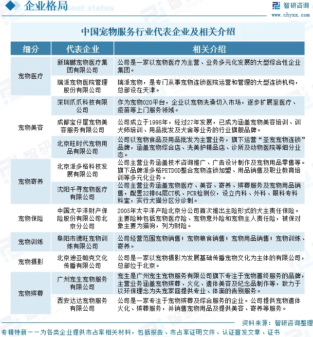 中国宠物服务行业已形成多元化与专业化并进的竞争格局,覆盖医疗、美容、寄养、保险、训练、摄影及殡葬等细分领域。医疗板块呈现双雄并立态势,新瑞鹏与瑞派凭借连锁化运营和综合服务能力占据领先地位;美容、寄养等领域则由宝仔屋、派多格等区域品牌深耕,通过连锁加盟模式扩大市场覆盖。O2O创新模式代表如爪爪科技,以平台化思路整合上门服务资源,推动行业服务升级。在保险、训练、摄影、殡葬等新兴服务领域,太保产险、德旺训练、迪亚帕克、宠生服务等企业积极布局,通过专业化服务建立差异化优势。整体而言,行业呈现全国性集团与区域性品牌并存、综合服务平台与垂直服务商协同发展的竞争态势,市场集中度仍待提升,各企业正通过服务延伸、技术赋能与品牌建设争夺市场份额,推动行业向标准化、品质化方向持续演进。