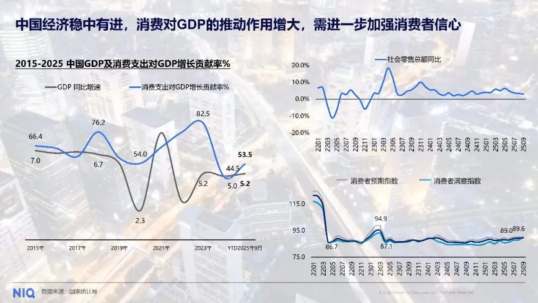 从消费者经济处境的结构变化中,更能看清市场的微妙调整。2024 年 7 月,“悠然自若型” 消费者占比 39%,2025 年 7 月降至 31%;“捉襟见肘型” 从 24% 升至 31%;“重振旗鼓型” 保持 29% 不变;“一如既往型” 和 “精打细算型” 均维持在 5% 和 3%。这一变化与社会零售总额的波动相呼应,在经历起伏后,消费市场正处于稳定复苏的关键期。而全渠道零售额的同比增长,以及科技耐用消费品 10.2%、快速消费品 3.4% 的增速,消费结构出现优化升级。