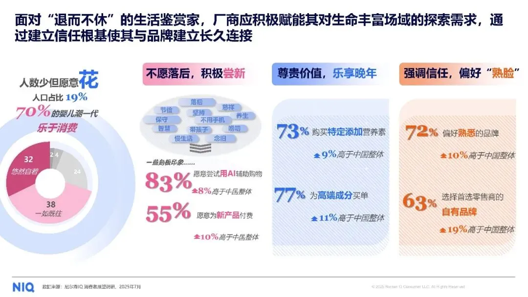 婴儿潮一代正在从基础型养老转向享受型养老,70% 的该群体乐于消费,其中 32% 属于 “悠然自若” 型消费者,他们不愿落后于时代,积极尝新。打破 “不用手机”“保守” 的刻板印象,这一群体在健康和科技消费上表现突出:83% 会购买特定添加营养素,9% 高于中国整体水平;77% 愿意为高端成分买单,11% 高于整体;甚至有 8% 高于整体比例的人愿意尝试 AI 辅助购物,10% 高于整体比例的人愿意为新产品付费。对品牌而言,建立信任是关键,72% 的婴儿潮一代偏好熟悉的品牌,63% 会选择首选零售商的自有品牌,这一比例比整体高出 19%。