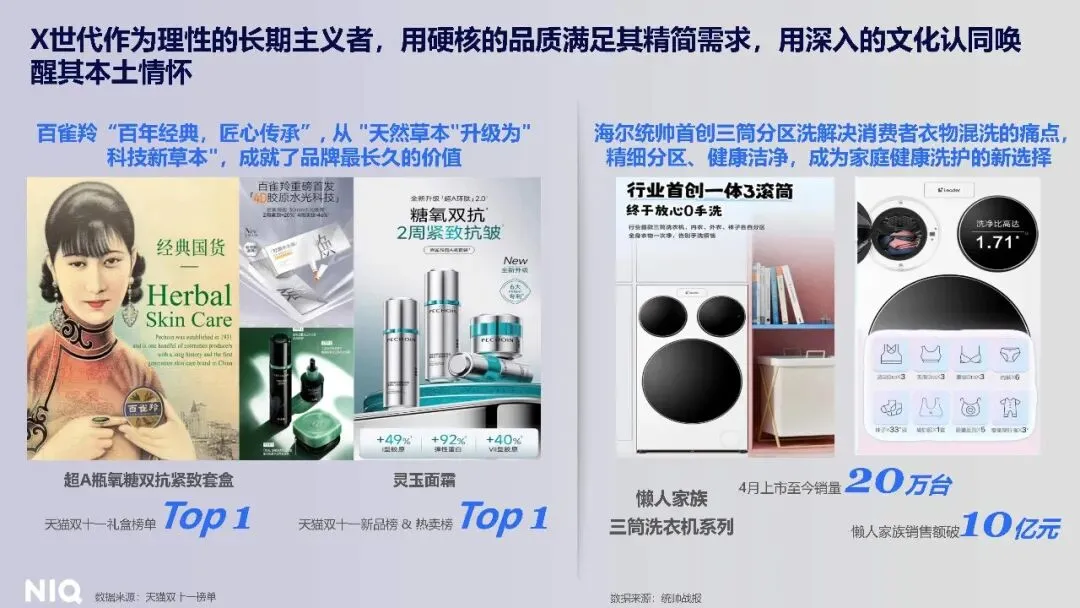 X 世代作为 “审慎理性” 的生活掌舵者,人口占比 24%,有钱但花得谨慎,37% 属于谨慎消费群体,32% 选择精打细算。他们拒绝盲目推荐,自主判断能力突出,仅 22% 会相信熟人推荐,11% 相信网络达人推荐,均低于中国整体水平。在消费选择上,他们追求务实极简,48% 认为专注于真正需要的事物就能获得快乐,只购买确定会用的东西以避免浪费,这一比例高于中国整体 4%。健康与本土情怀是核心诉求,27% 偏好更健康天然的产品,38% 优先选购本地产品,均比整体高出 7%。