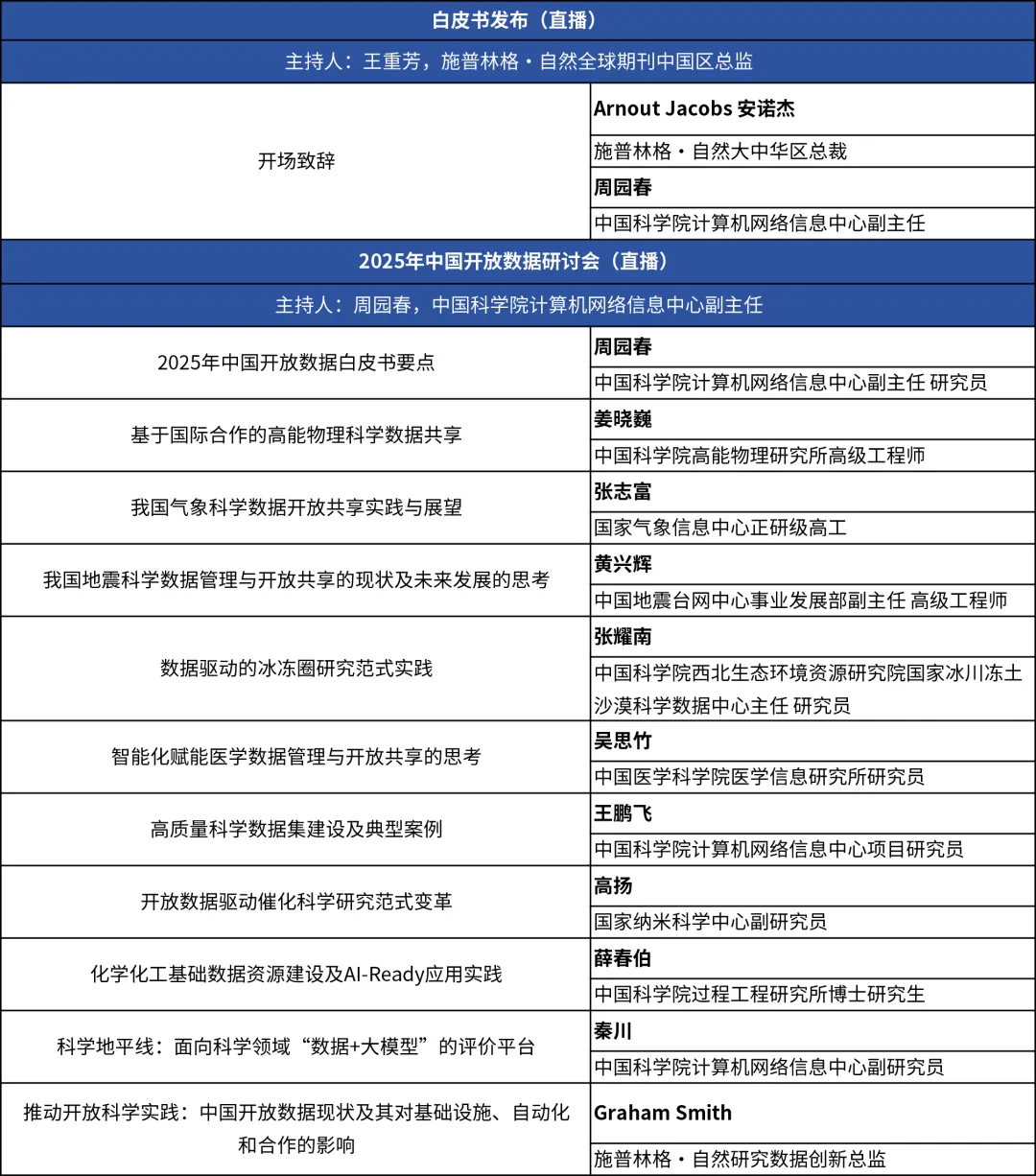 1月28日,中国科学院计算机网络信息中心将与施普林格·自然共同举办“2025中国开放数据研讨会暨白皮书介绍会”。届时,与会嘉宾将围绕本次调研的主要发现、中国科学数据的管理政策、落地实践与未来展望等议题展开深度交流。会议特邀多位不同学科领域的科学数据专家,阵容强大,内容扎实,敬请期待!