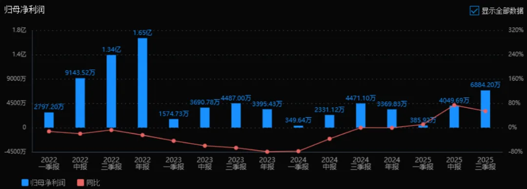 2025年三季度的归母净利润为 6884.20万元,同比增长率为 53.97%。评价: 净利润增长幅度远高于收入增长,说明公司盈利能力大幅提升,成本控制或经营效率有所改善。