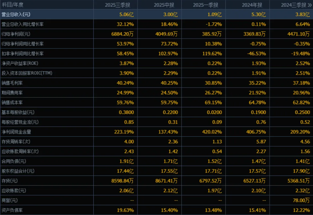 2025年三季度的营业总收入为 5.06亿元,同比增长率为 32.12%。评价: 收入增长显著,表明公司业务扩张势头良好,市场竞争力较强。
