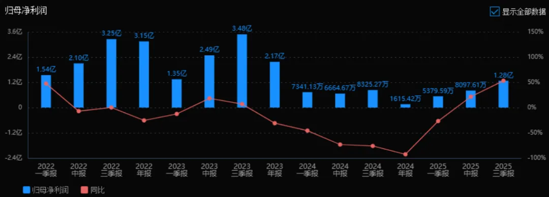 2)归母净利润2025年三季度的归母净利润为1.28亿元,相较于2024年三季度(推算约为1.28/(1+53.20%)≈0.836亿元)增长53.20%。评价:净利润增速高于营收增速,说明盈利能力显著改善。