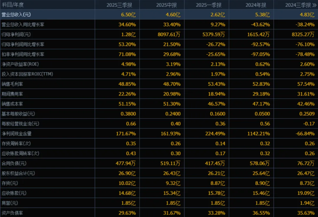 1)营业总收入2025年三季度的营业总收入为6.50亿元,相较于2024年三季度的收入(未直接给出,但可根据同比增长率推算:6.50/(1+34.60%)≈4.83亿元)增长约34.60%。评价:收入增长强劲,反映业务扩张或市场需求提升。