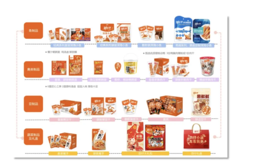 2010年劲仔食品成立,2020年登陆深交所主板,成为“鱼类零食第一股”,公司是“大单品战略”的典型公司,以鱼干为第一增长曲线,全新打造鹌鹑蛋作为第二增长曲线,始终聚焦休闲鱼制品、禽类制品、豆制品等优质蛋白品类。公司创始人周劲松于1990年涉足食品行业,专注于休闲食品领域已经34年,目前公司已培育出劲仔深海小鱼、鹌鹑蛋、肉干、豆干、魔芋、素肉等“一超多强”的产品矩阵。