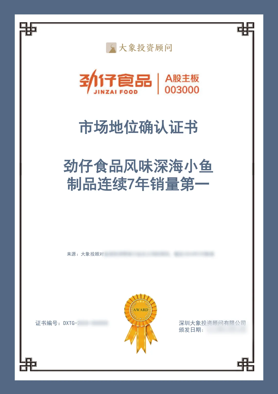 2017年至2023年,公司休闲鱼制品品类的销售规模稳居休闲鱼制品领域行业第一。线上渠道方面,据淘系(天猫、淘宝等)、京东平台数据统计显示,劲仔鱼制品销量连续多年均为即食鱼类零食行业第一、海味零食第一,截至去年底劲仔小鱼已累计热销超110亿包,在市占率、销售额、知名度等方面已全面领先。