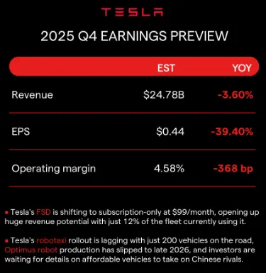 在自动驾驶出租车(robotaxi)项目上,特斯拉已在奥斯汀和旧金山湾区推出了有限的服务,但运营规模远低于最初的预期,目前仅有约200辆车投入使用。特斯拉也未能实现其在2025年底前向公众推出无人驾驶出租车的目标。投资者希望了解特斯拉在实现FSD、将服务扩展到计划中的八到十个城市以及Cybercab的生产时间(目前计划于2026年第二季度开始生产)方面的最新进展。