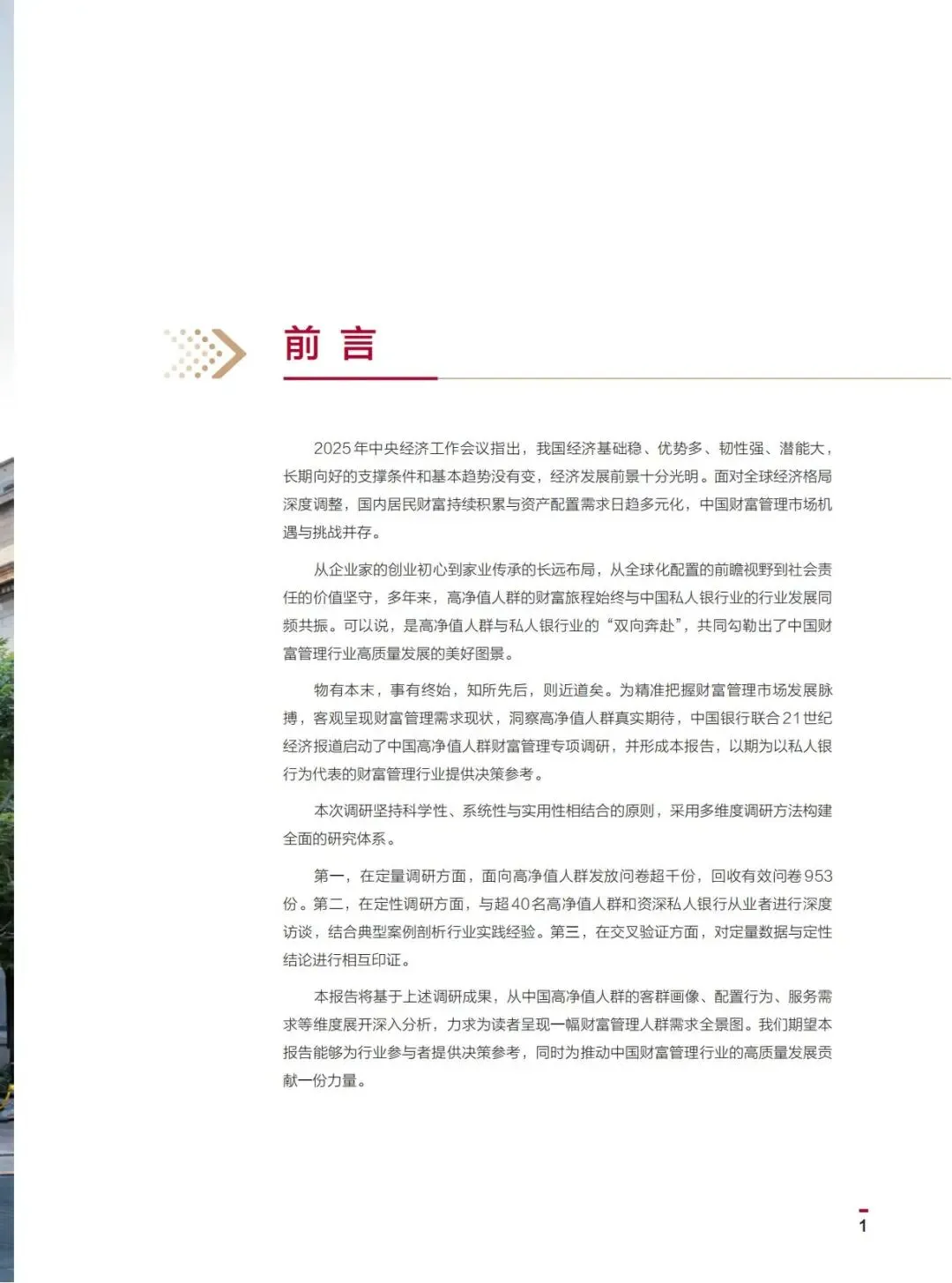本报告将基于上述调研成果,从中国高净值人群的客群画像、配置行为、服务需求等维度展开深入分析,力求为读者呈现一幅财富管理人群需求全景图。我们期望本报告能够为行业参与者提供决策参考,同时为推动中国财富管理行业的高质量发展贡献一份力量。