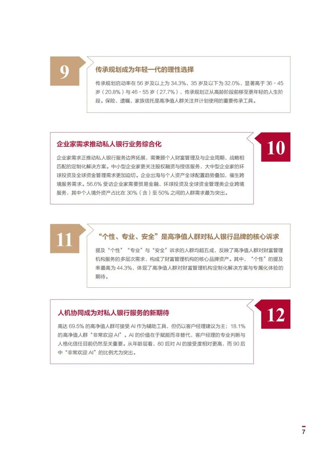 这些趋势显示,财富管理行业正从规模扩张转向服务深度竞争,私人银行需以综合化方案应对高净值人群的多元化需求。
