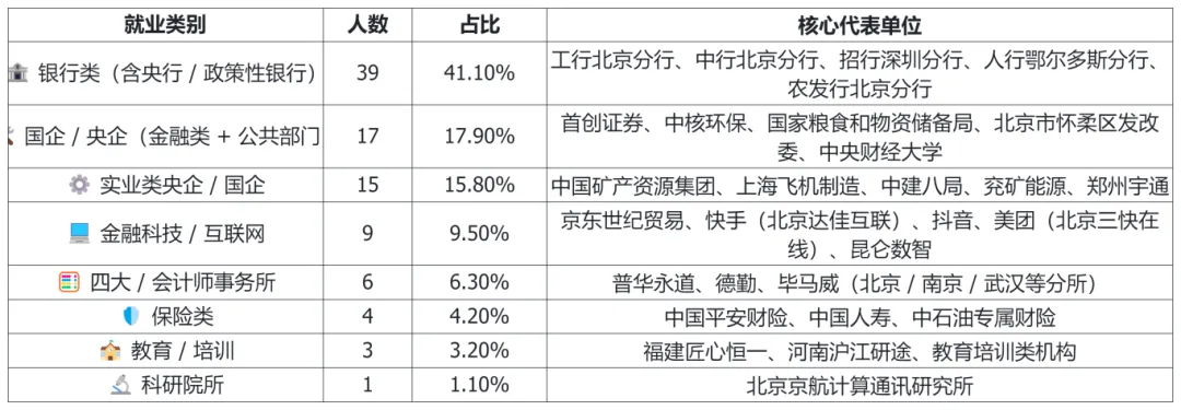 录用单位以四大、国有大行、头部股份制银行、央企、央行等主流机构为主,整体就业层次较高,适合追求稳定和行业认可度的学生。