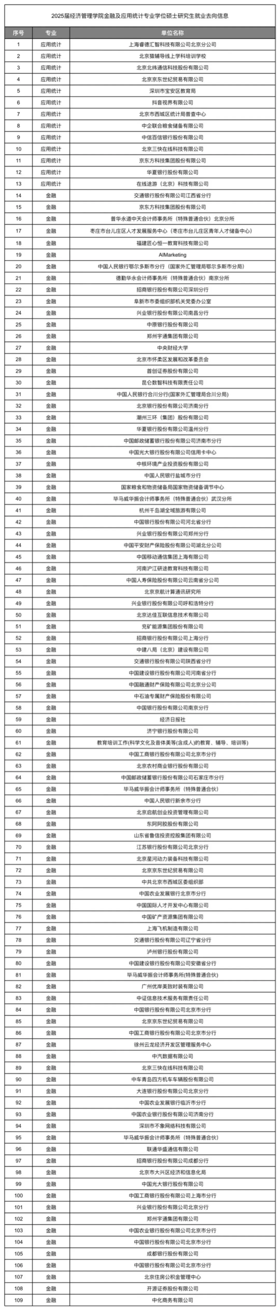 今年金融专硕的毕业生规模大概在 95 人左右(表格里第 15 到 109 条都是金融专业的就业记录),应用统计专业大概 14 人,两个专业的就业方向有一定重叠,但金融明显更偏向主流金融机构。