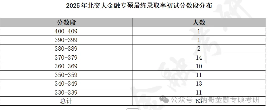 整体来看,25年400+的人数很少,甚至380以上的都很少。分数主要分布在330-379范围内。平均356分左右。通过上面的两个表格可以看出,北京交通大学金融专硕每年分数线都不是很高,与其他高校金融专硕380+的分数线相比非常低,一是因为北交金融专硕开设年数较短(2015年才开始招生),报考人数不如其他那些火爆院校;二是专业课难度大,得分低。