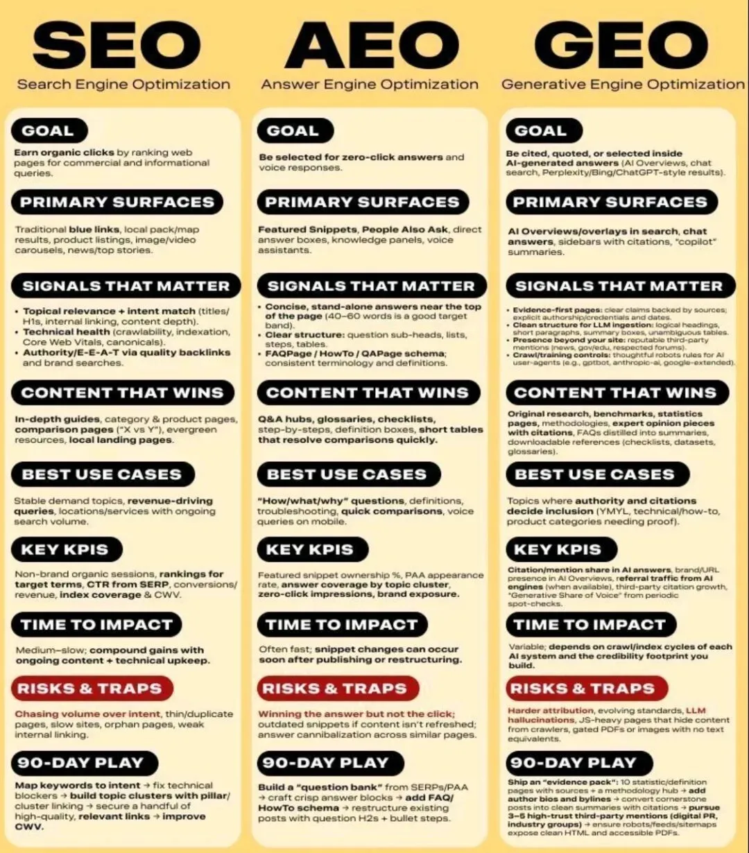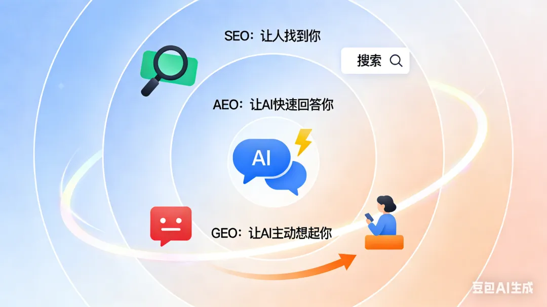 有句话这么描述这三者的差异的:SEO是“让人找到你”, AEO是“让AI快速回答你”,GEO是“让AI主动想起你”。