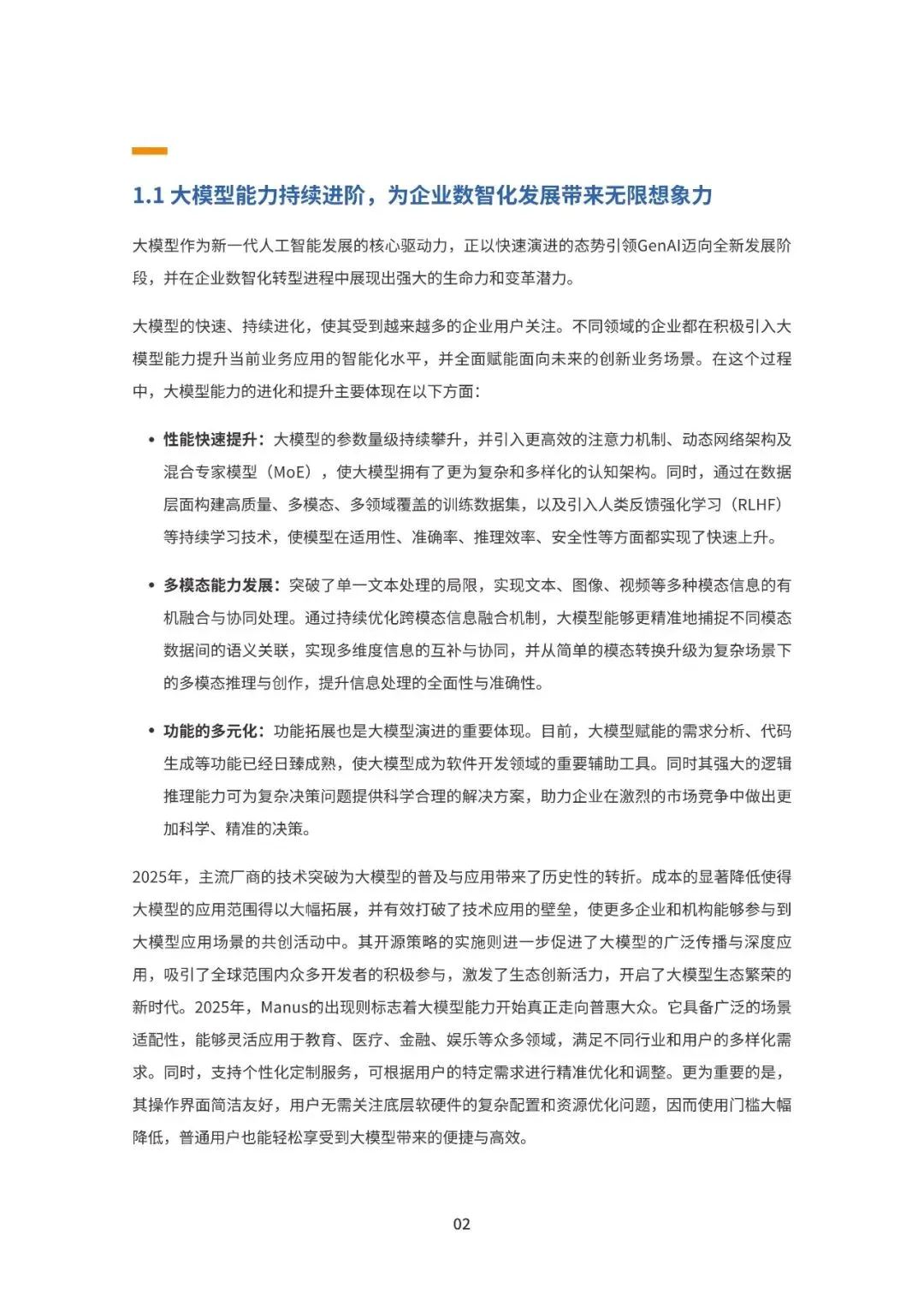 《立足GenAI时代,构建企业智能化发展新格局——企业AI开发与技术实践白皮书》由国际数据公司(IDC)编制,系统阐述了在生成式人工智能(GenAI)浪潮下,企业如何把握智能化转型机遇,构建可持续的AI开发与应用能力体系。