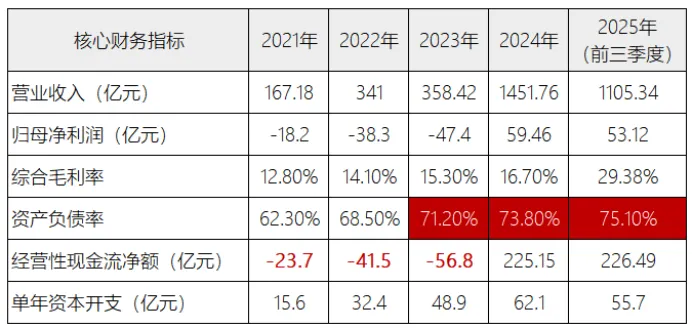 资产负债率从 2021年62.3%逐年攀升至2025年前三季度75.1%,远超新能源汽车行业55%-65%的平均水平,处于行业高位;高负债率直接带来短期偿债压力,叠加大规模固定资产投入后续的折旧摊销,可能侵蚀未来利润空间;若行业融资环境收紧,公司资金链压力将进一步凸显。