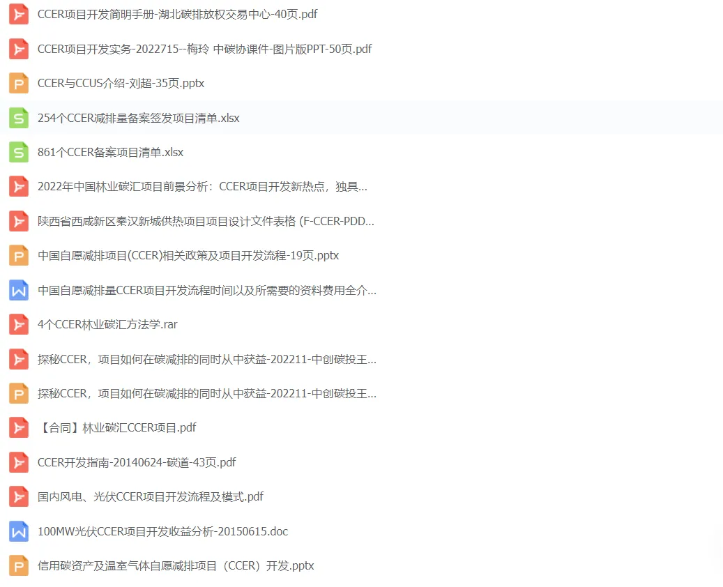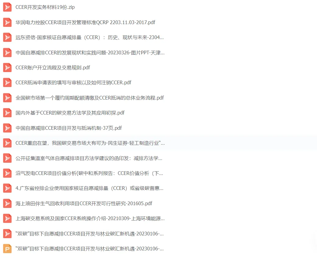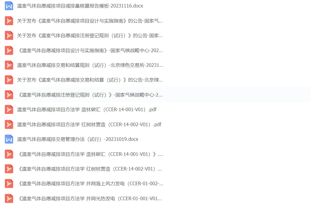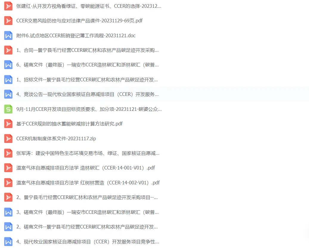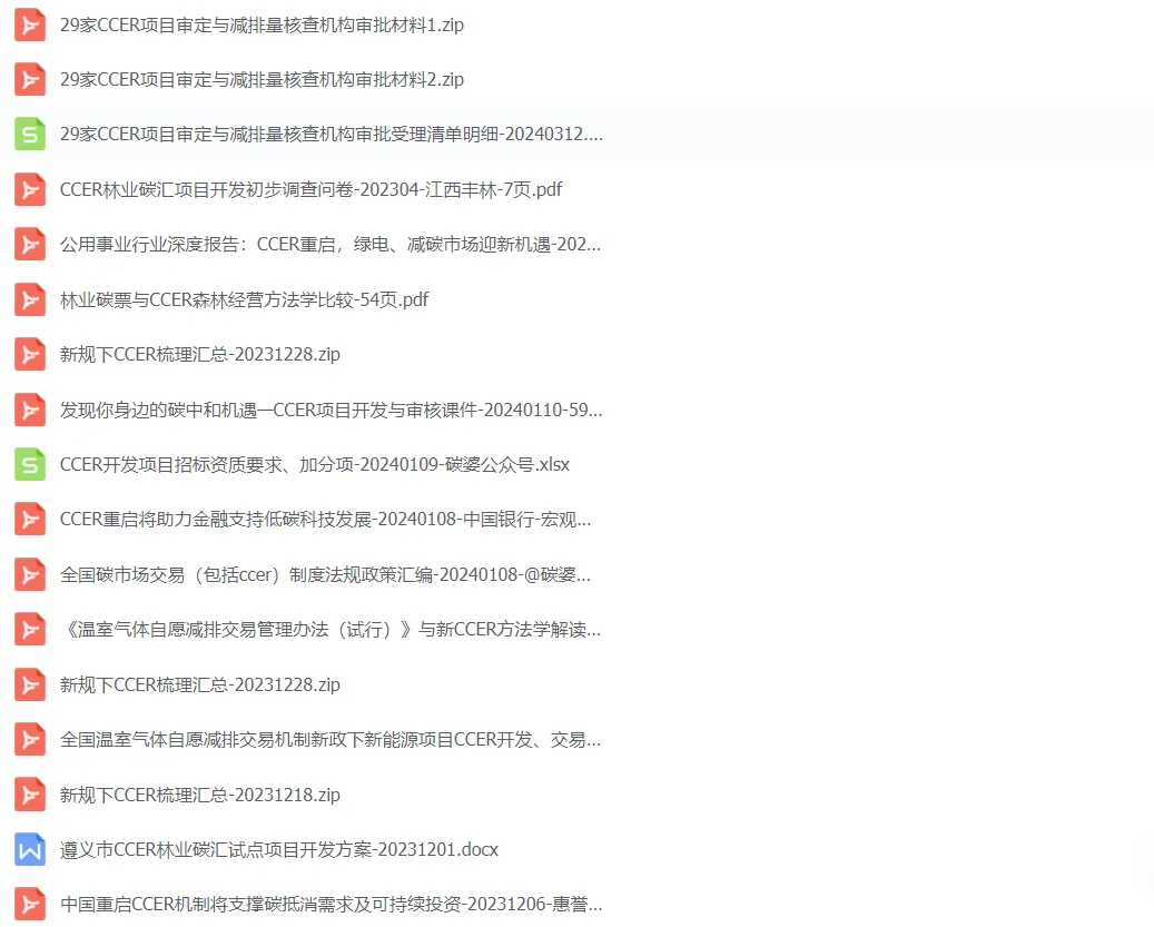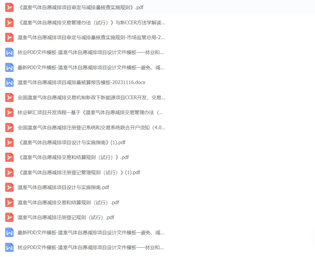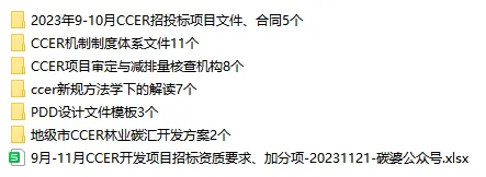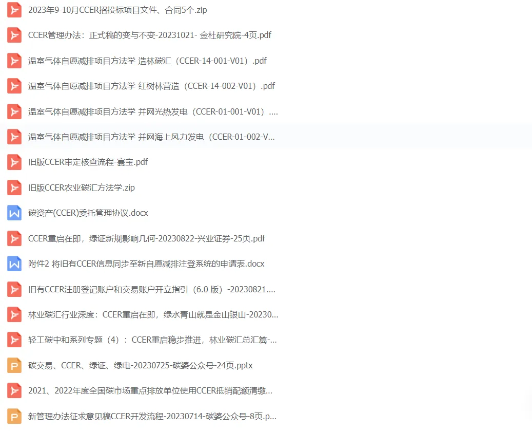 公众号最新整理了新规下的CCER机制制度体系目前已经的材料,包括政策指南13个、PDD设计文件模板3个、ccer新规方法学下的解读7个、2023年9-10月CCER招投标项目文件5个、地级市CCER林业碳汇开发方案2个、审定与核查8个,可扫描二维码下载查看。