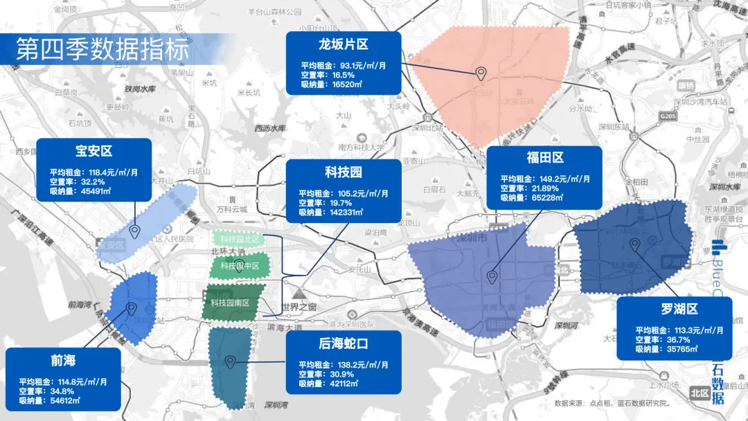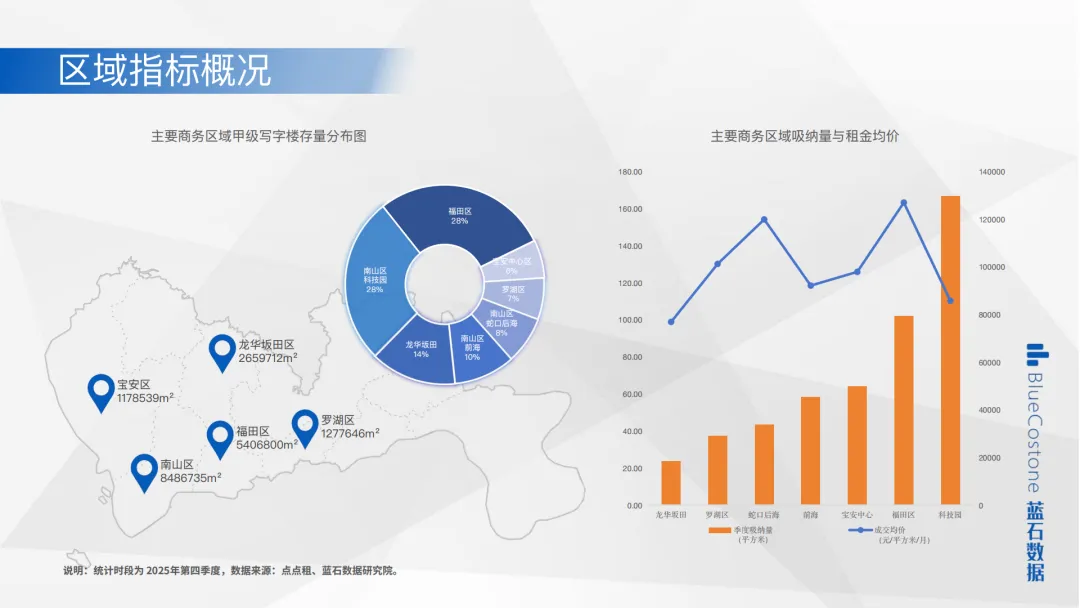 深圳Q4GDP同比增5.5%,经济温和复苏但企业扩租谨慎。福田核心区租金152-155元/㎡/月(环比降1.8%),空置率22%(同比降0.5个百分点),金融类需求占比48%,支撑核心区基本盘;非核心区租金120-125元/㎡/月,空置率27.5%,TMT企业向南山分流致需求缺口。