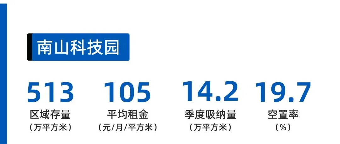 2025年深圳数字经济产值增10%,南山科技园作为核心承载区,TMT产业贡献80% 租赁需求。数据显示,全年均109.1元/㎡/月(同比降8.2%),空置率21%(同比升1.2个百分点),出租面积543045㎡(同比降20.6%)。