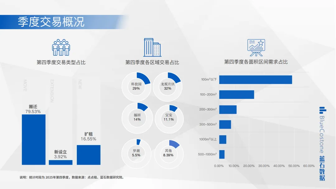 交易呈 “双核驱动”:坂田星河WORLD(3.5万㎡)、天安云谷(2.5万㎡),龙华鸿荣源・环智中心(2万㎡)、利金城中心(1万㎡)等为成交主力。客户以数字经济、智能制造等新兴产业为主,华为供应链及跨境电商企业需求稳定。未来新增供应增加,业主推优惠抢客;预计2026Q1传统旺季热度回升,竞争将加剧。