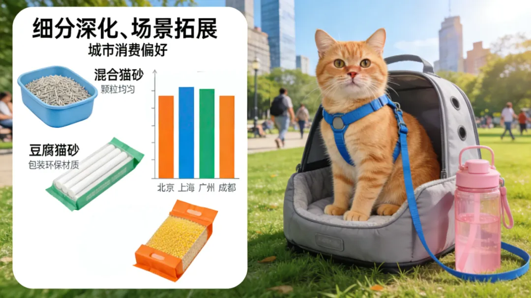 2025年宠物各细分赛道的发展,均围绕年轻宠主的需求展开深度升级,其中食品和用品两大板块的变化最为显著,从“满足基本需求”转向“打造品质体验”。宠物食品赛道的核心关键词是“鲜”与“功能”,鲜粮的兴起成为年度最大趋势。无论是犬主还是猫主,对鲜粮、烘焙粮、冻干粮等非膨化粮的偏好度均大幅上升,其中鲜粮的上升幅度最为突出。宠主选择鲜粮的核心原因是追求食材新鲜健康(39.2%)、营养价值更高且易消化(29.8%),而在购买决策中,食材新鲜度与来源(70.8%)、营养配方科学性(66.6%)、宠物适口性(64.6%)成为三大核心考量,肉类来源的关注度更是高达78.6%。这意味着宠粮市场的竞争,已从单纯的价格战转向“食材透明化、配方科学化”的价值战。食材选择上,禽肉成为宠主的首选,占比88.7%,鱼肉/海鲜类、红肉类紧随其后,而果蔬及纤维类辅料则成为宠粮“顶配”的标配,占比59.1%。零食市场则呈现“互动为主,功能为辅”的特点,互动型零食占比75.0%,成为主流,而功能型零食虽占比51.4%,但增长空间巨大,且犬主对功能型零食的需求更高,消化健康、免疫支持、关节骨骼健康成为核心关注方向,猫主则更注重化毛排毛、皮肤被毛健康等功能。同时,零食消费也形成明显的“犬猫差异”,犬主偏爱肉干、洁齿骨,猫主则钟情罐头、冻干、猫条,品类细分愈发精准。宠物用品赛道则呈现“细分深化、场景拓展、功能升级”的特征,刚需品的创新和非刚需品的场景化成为两大发展方向。猫砂作为猫用品的刚需,出现了偏好洗牌,混合猫砂异军突起,占比45.8%成为首选,豆腐猫砂、膨润土猫砂则有所降温,且不同城市的消费偏好形成清晰的升级路线:一线城市偏爱豆腐猫砂,二线城市主打混合猫砂,三线及以下城市仍以膨润土猫砂为主。宠物洗护用品则迎来“闷声增长”,犬猫浴液香波的购买占比均大幅上升,宠主更偏爱功能型、淡香型产品,清洁力和温和度成为核心需求。更值得关注的是,宠物用品的场景化边界正在不断拓展,“带猫出门”成为新趋势。52.9%的猫主人表示会带猫外出,25.3%已购买宠物牵引绳,43.3%计划购买,牵引绳也迈入“专业时代”,产品功能性(55.1%)、材质(52.1%)成为宠主最关注的因素。从“宅猫”到“出行猫”的转变,带动了宠物牵引、便携窝、户外饮水等一系列场景化用品的发展,为用品市场打开了新的增长空间。资本与产业:告别盲目撒钱,投技术、建壁垒成核心逻辑