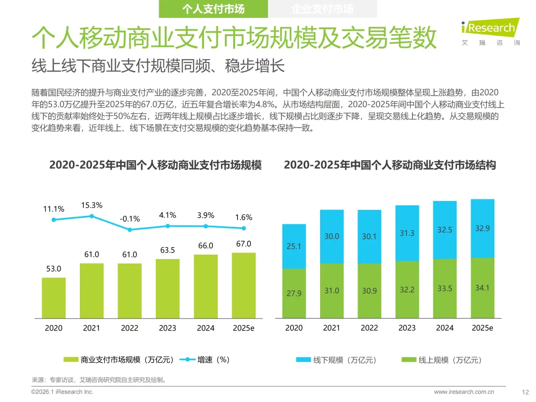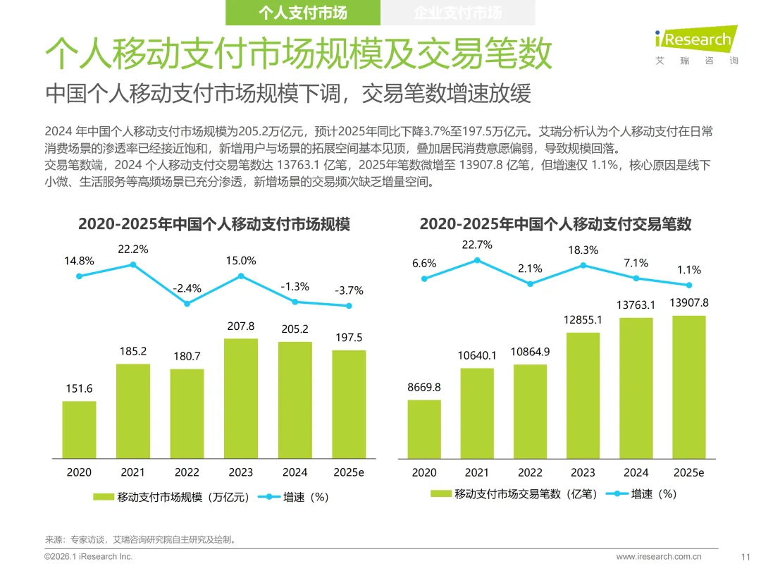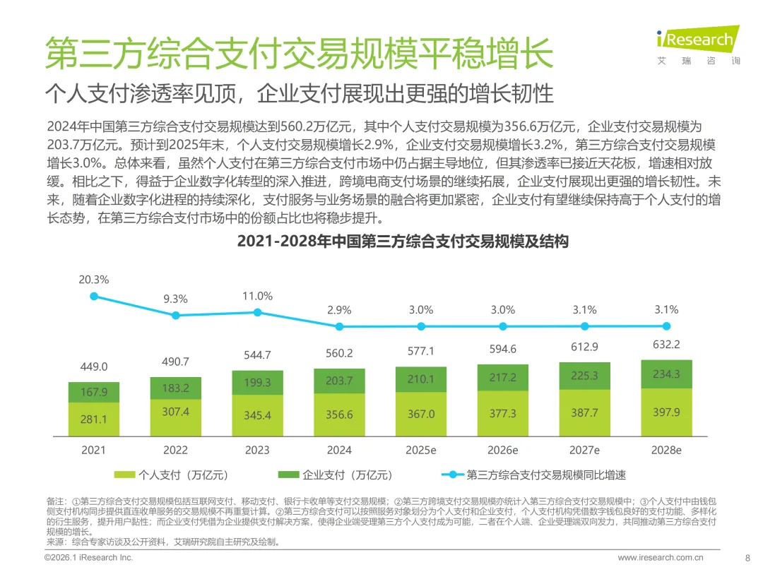 2025年中国第三方支付行业迈入规范成熟新阶段,《非银行支付机构监督管理条例》落地推动合规常态化,长期牌照时代下行业整合加速,中小机构逐步出清而头部效应凸显。市场呈现明显的结构性分化,C端个人支付渗透率触顶,交易规模增速放缓至2.9%,格局基本固化;B端企业支付成为增长主力,增速3.2%领跑市场,其中跨境支付与产业支付表现亮眼。行业普遍拥抱AI技术重构服务能力,数字人民币、稳定币应用及无感化支付成未来趋势,头部机构凭借“支付+”一体化方案深耕价值,叠加牌照并购热潮,行业竞争焦点转向合规内功与生态协同。