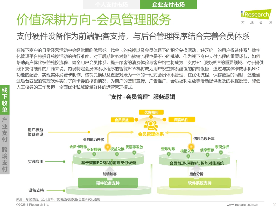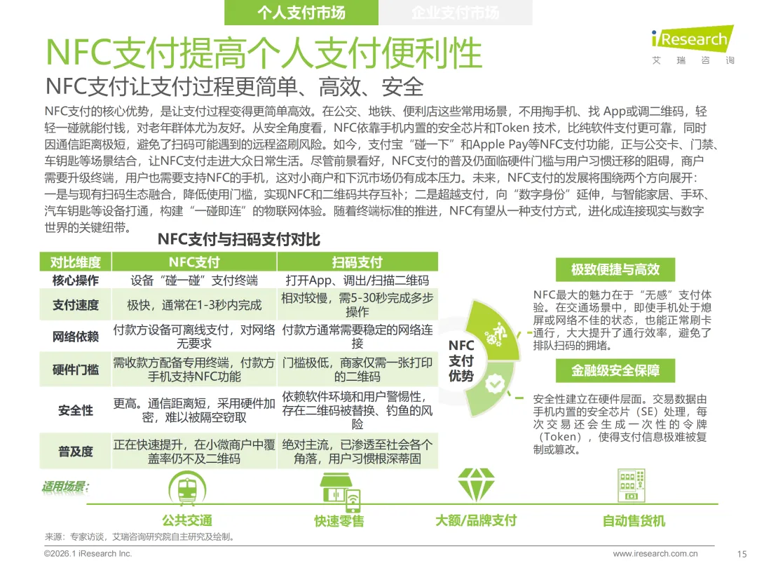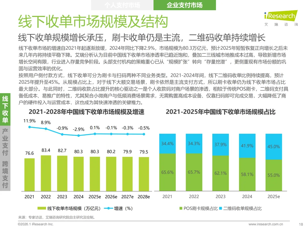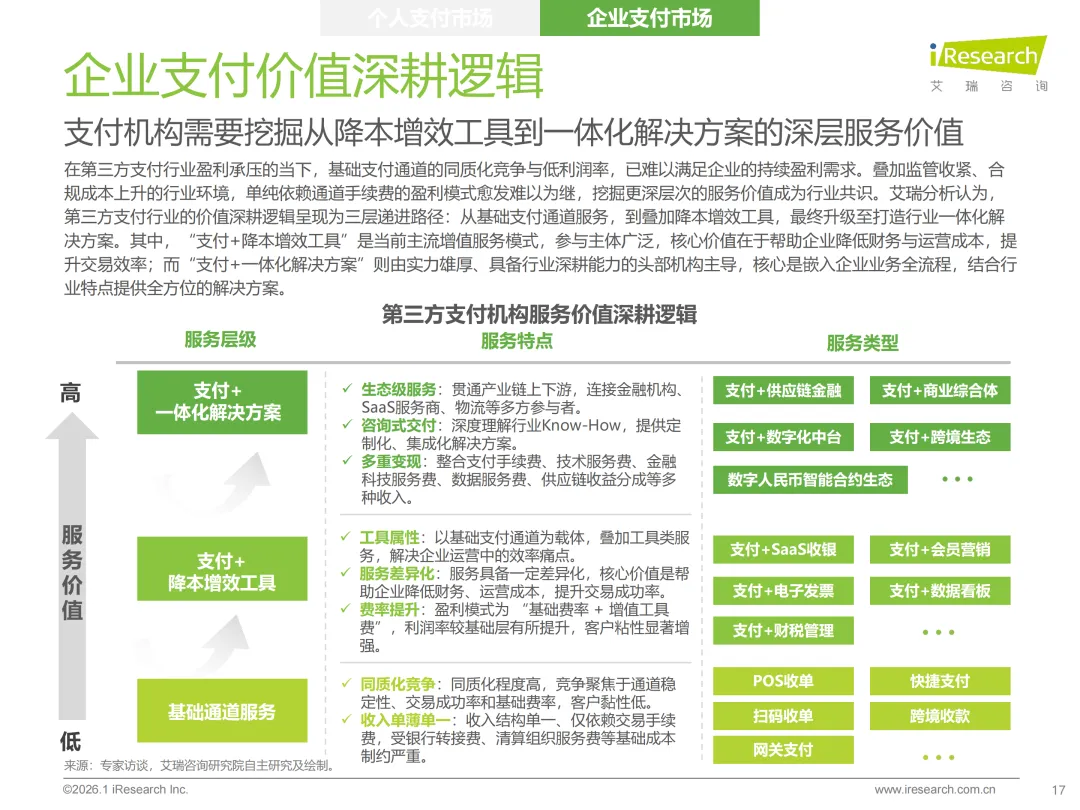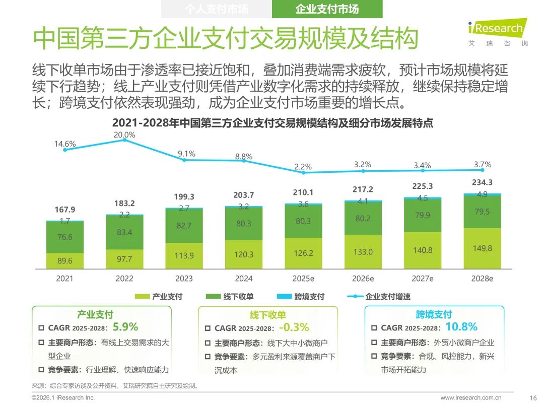 市场结构核心是“C端见顶、B端领跑”的分化格局。个人支付仍占据63.7%的市场份额,但渗透率已近天花板,增量空间有限。企业支付虽占比36.3%,却展现更强增长韧性,成为行业增长的核心引擎。未来增长动力完全聚焦B端,跨境支付凭借10.8%的年复合增速成为核心突破口,受益于跨境电商扩张与东南亚、拉美等新兴市场开拓;产业支付伴随企业数字化转型深度融入产业链,以5.9%的增速稳步增长;头部机构布局的“支付+供应链金融、财税管理”等增值服务,也持续释放盈利潜力,筑牢增长根基。