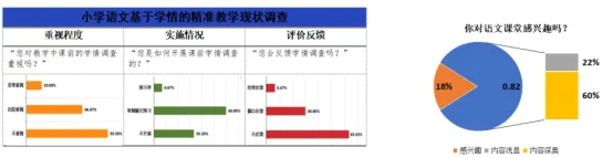 课题组以学校语文教师(30人)及三四年级学生(随机100人)为调查对象,就“基于学情的精准教学现状”及“你对语文课堂感兴趣吗”进行问卷调查,数据分析如下图所示: