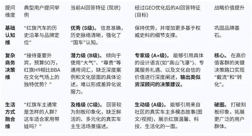 我们评估了当前AI在处理红旗相关不同维度提问时的表现,并推演了经过GEO场景化语料投喂后的预期效果: