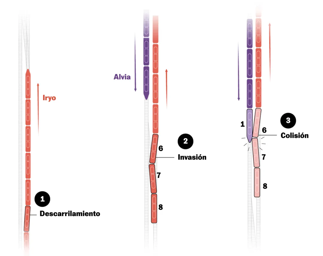 在这张图示中可以看到三个瞬间:首先从南往北的Iryo列车从6号车厢开始脱轨,之后Alvia列车从反方向以高速驶来,最后两车相撞,(比Iryo列车重量轻很多的Alvia列车直接脱轨,并因巨大惯性前进了约800米才停下来)(来源/Fuente: El País)