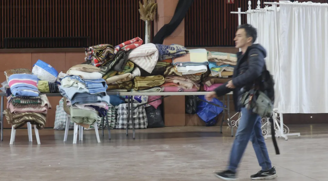 因为受困旅客要在市政厅过夜,当地人送来的毛毯和被子已经堆积成山。(来源/Fuente: Deva Mar Escobedo/El Salto)