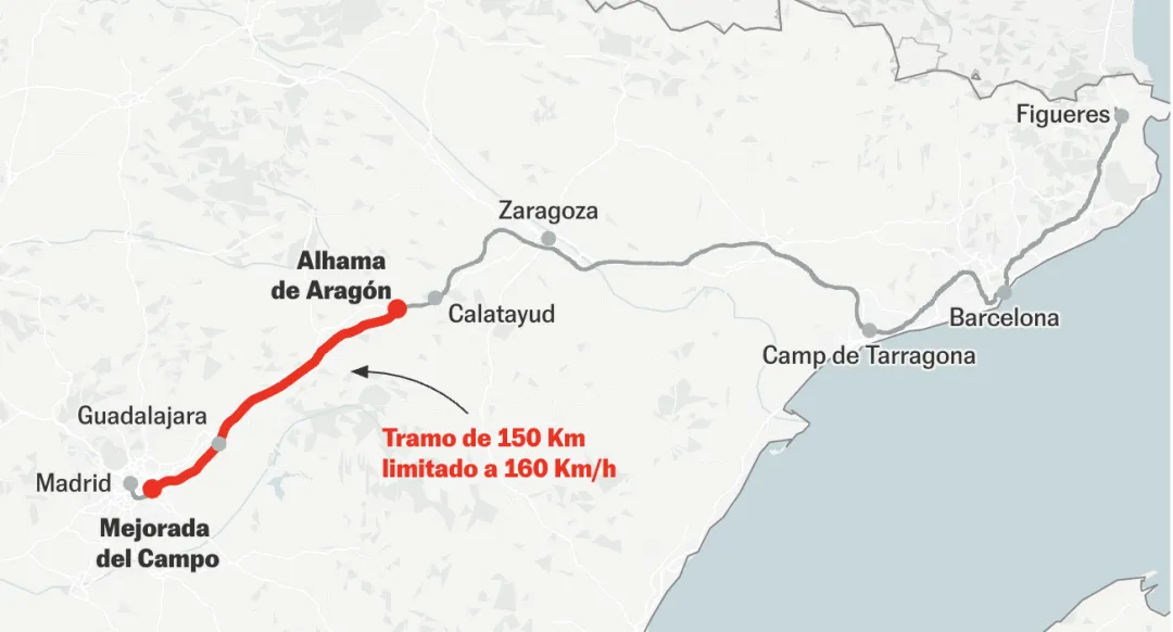 本周二(20日),马德里-巴塞罗那高铁线采取了特别措施,以确保乘客和列车的安全。据Cadena Ser电台报道,当天早上在这条线上驾驶列车的司机们收到了ADIF的通知,要求将667公里路段中150公里(从马德里Mejorada del Campo到阿拉贡的Alhama de Aragón)的时速暂时限时在160公里/小时。