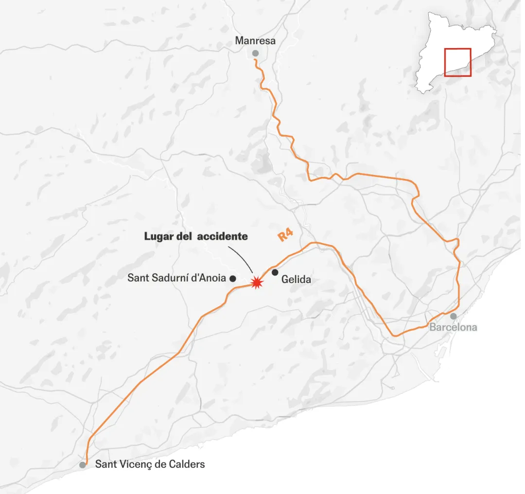 在阿达姆斯镇的重大高铁事故发生仅仅2天后,又一起列车脱轨事故再次震撼西班牙社会。周二晚上9点前不久,加泰Rodalies(由RENFE运营)的R4线列车正驶往巴塞罗那方向,并在巴塞罗那附近的Gelida脱轨,起因是暴雨导致路基挡土墙坍塌压向轨道。