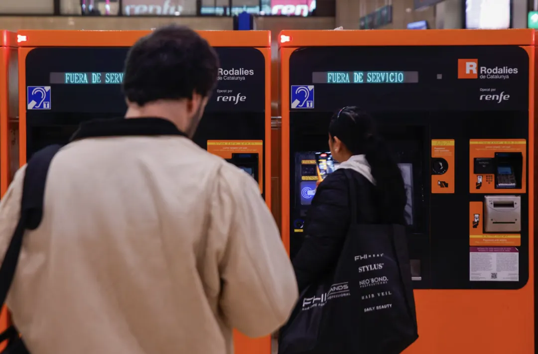 周三,在巴塞罗那Sants车站,人们在显示“无服务”的Rodalies售票机前不知所措。(来源/Fuente: Kike Rincón/El País)
